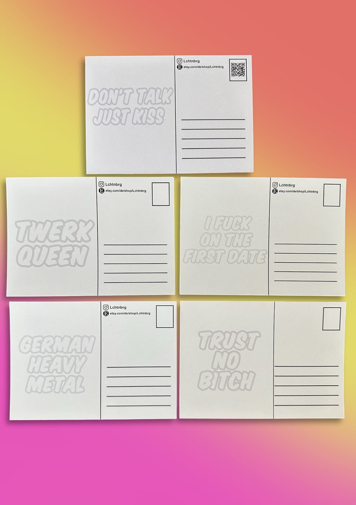 5er Set Postkarten DIN A6 (Maße 14,8cm x 10,5cm). Rückseite einfarbig bedruckt.