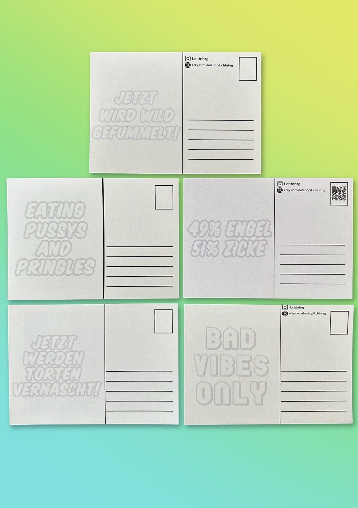5er Set Postkarten DIN A6 (Maße 14,8cm x 10,5cm). Rückseite einfarbig bedruckt.