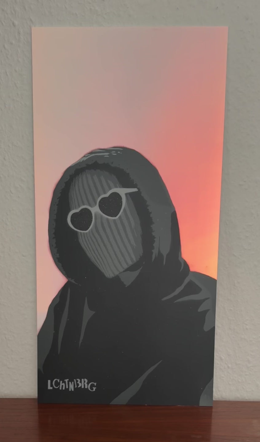 5 lagiger Stencil auf einen holographischen Spiegel. Maße 25 x 50 cm